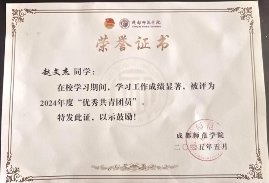 赵文杰,男,2006年出生,四川绵阳人,共青团员,2024年开始就读于与成都师范学院联合办学四川交通职业技术学院的汽车服务工程专业。