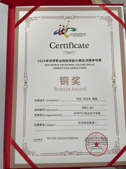 在中考过后选择了成都汽车职业技术学校,进入学校后了发现自己对动手方面极其感兴趣便选择向专业方面发展,加入了技能大赛集训队,在训练中所遇到困难,我会主动梳理核心问题,通过查阅理论知识补充缺陷,向老师和同学请教,经过不断努力学习获得了参加比赛名额,获得了2023年“中银杯”四川省职业院校技能大赛汽车车身修复与美容赛项一等奖,2024年世界职业院校技能大赛总决赛汽车车身修复与美容铜奖,在此过程中团队发明了实用型专利。
