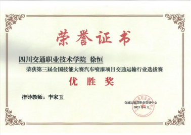 第三届全国技能大赛汽车喷漆项目交通运输行业选拔赛“优胜奖”;